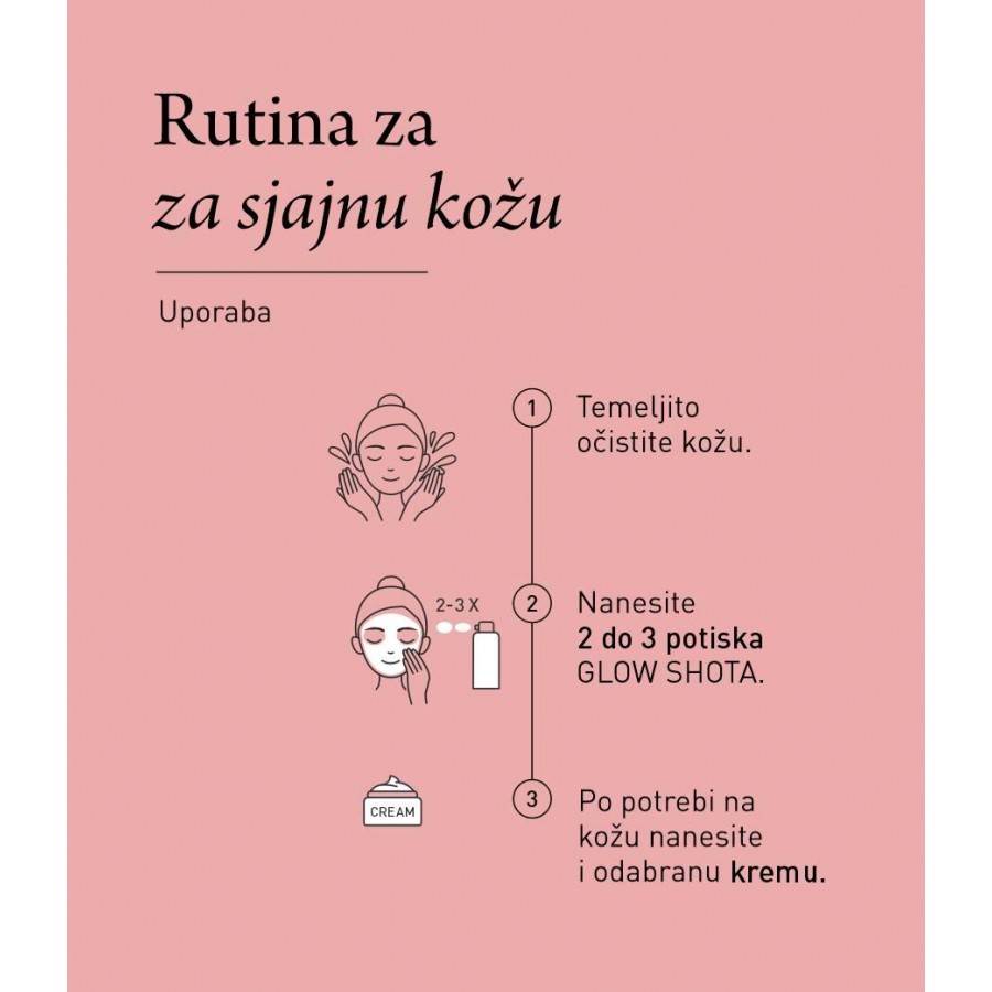 - Glow Shot možete pomiješati s kremom u dlanu i potom zajedno nanijeti na lice.