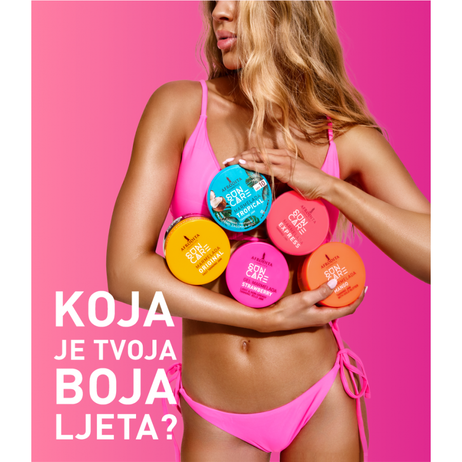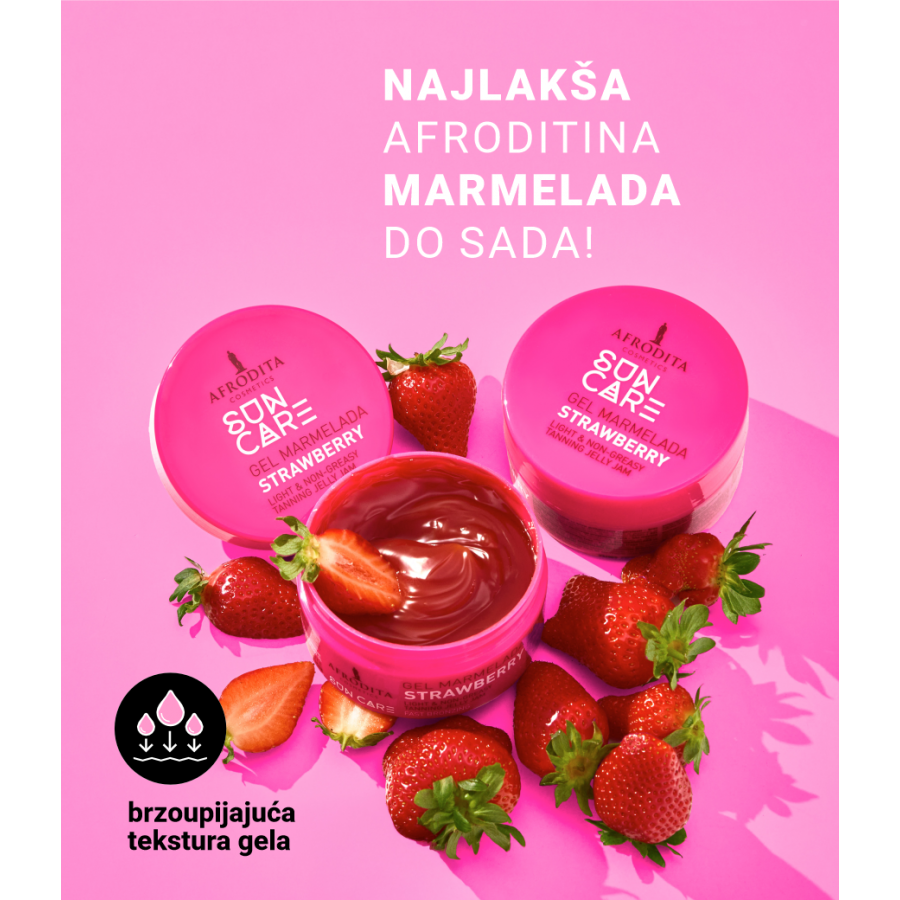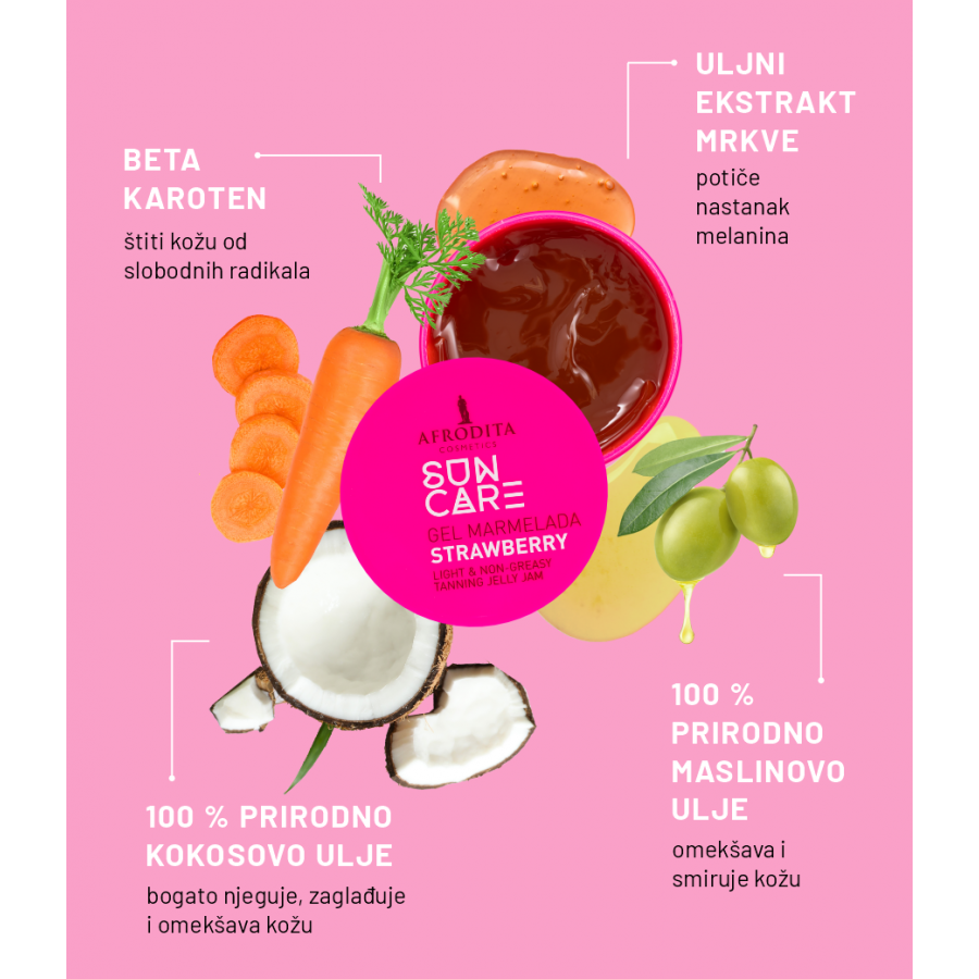 Najlakša Afroditina marmelada do sada. Sa snagom koncentrata mrkve pruža intenzivnu preplanulost i meku, njegovanu kožu, bez masnog traga. Lagana tekstura gela brzo se upija, a slatkasti voćni miris opušta osjetila tijekom ljetnog dana. Savršena za sve koji žele lakšu teksturu, jednostavno nanošenje i bezbrižnu ljetnu preplanulost.