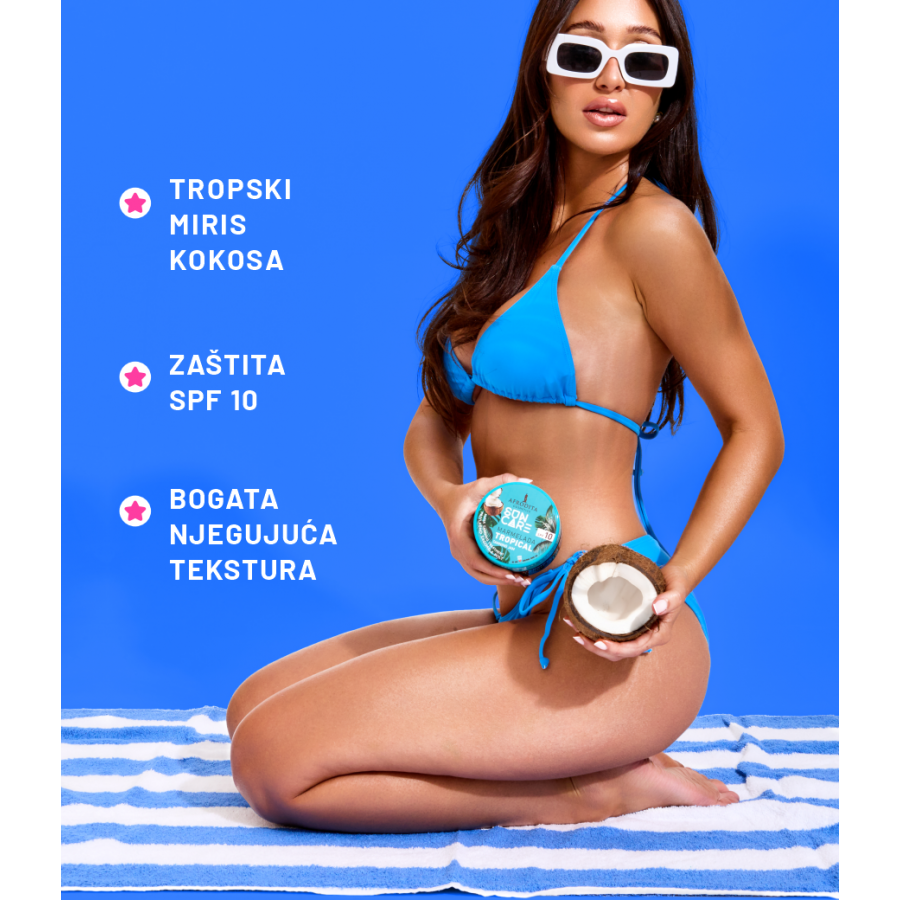 Ova marmelada sa zaštitnim faktorom SPF 10 omogućuje sigurnije uživanje na suncu te istovremeno osigurava intenzivno postizanje privlačne preplanule puti. Obogaćena 100 % organskim kokosovim uljem, kakao i karite maslacem vlaži, njeguje i štiti kožu, a tropski miris odvodi te u svijet egzotičnih doživljaja.