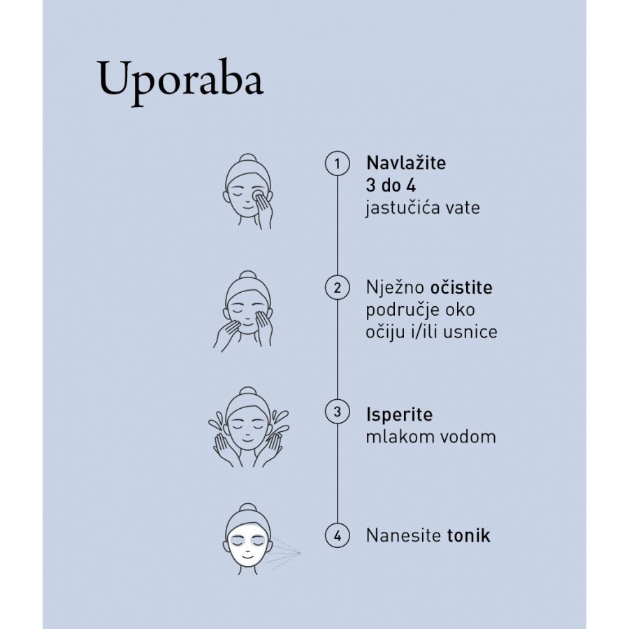 - Odstranjivačem dobro navlažite 4 jastučića vate i nježno očistite područje oko očiju i/ili usnice.