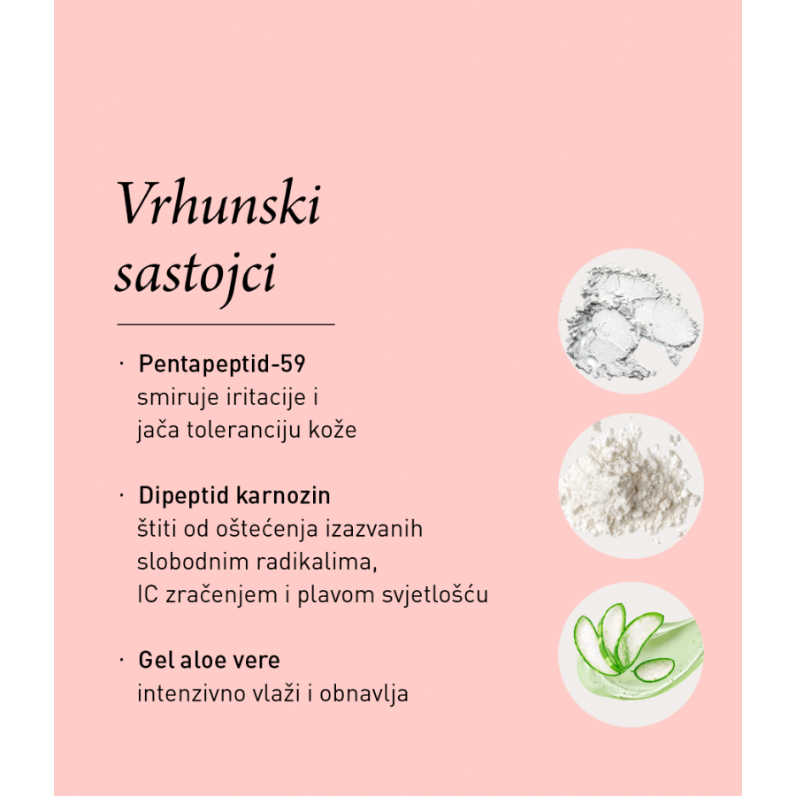 Sadržava anti-age dipeptid karnozin koji djeluje kao snažan antioksidant te štiti kožu od preranog starenja zbog štetnih vanjskih čimbenika. Obogaćen pentapeptidom-59 istodobno smiruje iritacije te dokazano smanjuje osjetljivost kože: -26 %.*