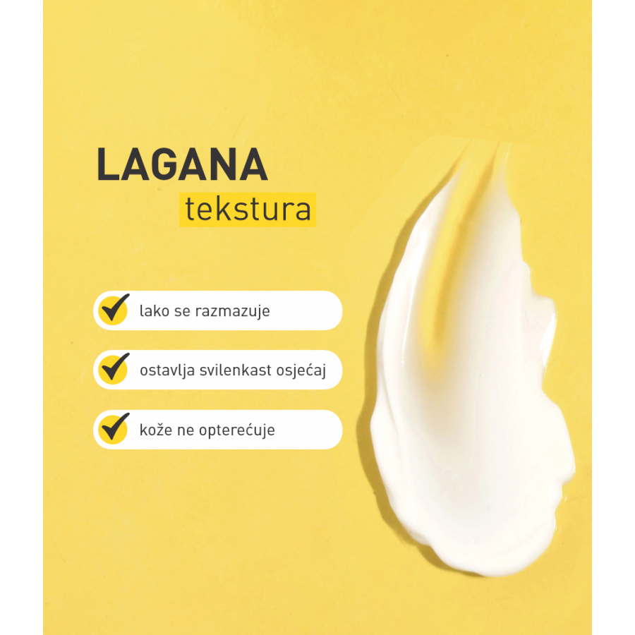 - Usprkos izuzetno hranjivom sastavu ne čini kožu teškom. Lako se razmazuje, brzo se upija te pruža koži izuzetno ugodan osjećaj.
