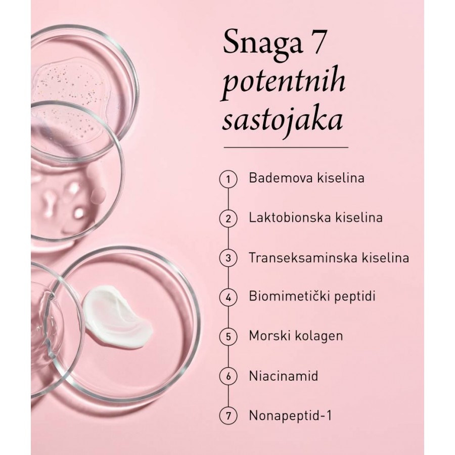 Sastojci: Aqua, Glycerin, Pentylene Glycol, Cetearyl Ethylhexanoate, Helianthus Annuus Seed Oil, Caprylyl Methicone, Glyceryl Stearate Citrate, Panthenol, Dimethicone, Butylene Glycol, Polyglyceryl-6 Laurate, Hydrogenated Polyisobutene, Hydrogenated Polydecene, Hydrogenated C6-14 Olefin Polymers, Cetearyl Isononanoate, Tranexamic Acid, Mandelic Acid, Niacinamide, Lactobionic Acid, Carnosine, Nonapeptide-1, Palmitoyl Tripeptide-1, Palmitoyl Tetrapeptide-7, Pentaerythrityl Tetraisostearate, Silica Dimethyl Silylate, Sodium Chondroitin Sulfate, Atelocollagen, Tocopherol, Ethyl Ferulate, Humulus Lupulus Extract, Xanthan Gum, Sodium Lactate, Polyacrylate Crosspolymer-11, 1,2- Hexanediol, Ethylhexylglycerin, Carbomer, Coco-Glucoside, Myristyl Glucoside, Lauryl Glucoside, Caprylyl Glycol, Phenoxyethanol, Hexylene Glycol, Citric Acid, Parfum, Tetramethyl Acetyloctahydronaphtalenes, Geranyl Acetate, Terpineol, Menthol, Vanilin, Linalyl Acetate