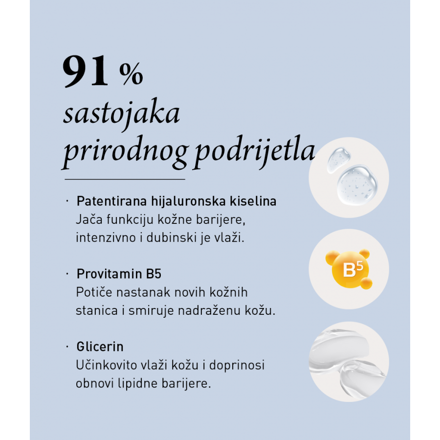 - Obogaćena iznimnim ovlaživačima: hijaluronska kiselina, provitamin B5 i glicerin tijekom čišćenja istodobno njeguju kožu i dodatno je štite od isušivanja.