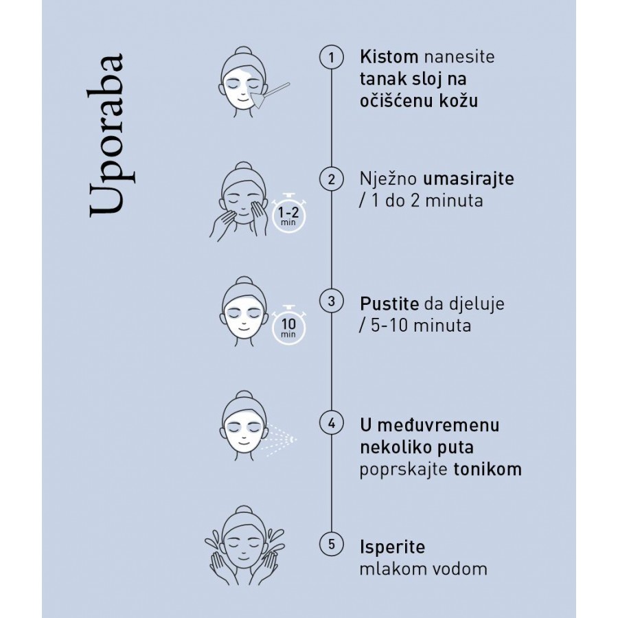 - Nanošenje: nanesite tanak sloj pilinga četkicom na dobro očišćenu i osušenu kožu. Nježno umasirajte i pustite djelovati 5 – 10 minuta.