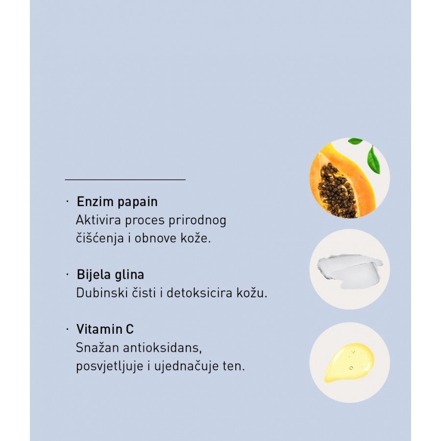 Sastojci: Kaolin, Maltodextrin, Sodium Cetearyl Sulfate, Sodium Ascorbyl Phosphate, Acrylates/C10-C30 Alkyl Acrylate Crosspolymer, Papain, Centella Asiatica Extract, Silica, Sodium Bicarbonate, Parfem