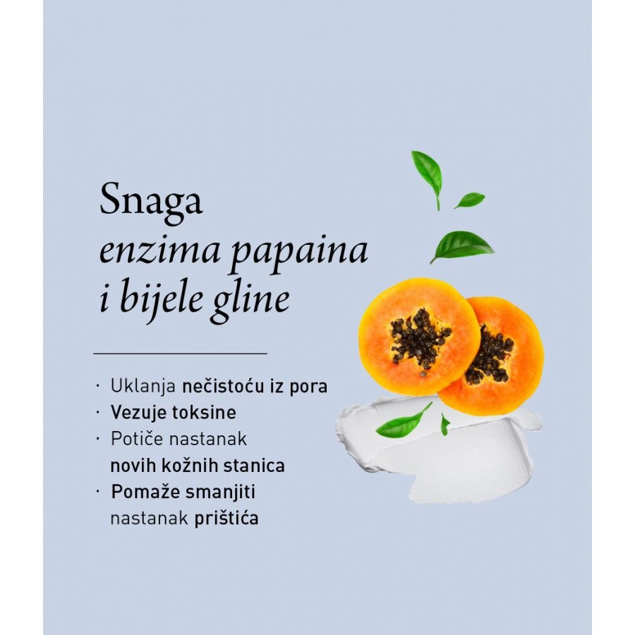 - Enzim papain aktivira neinvazivni proces temeljitog prirodnog čišćenja kože. Razgrađuje odumrle stanice kože i potiče prirodni proces njezine obnove.