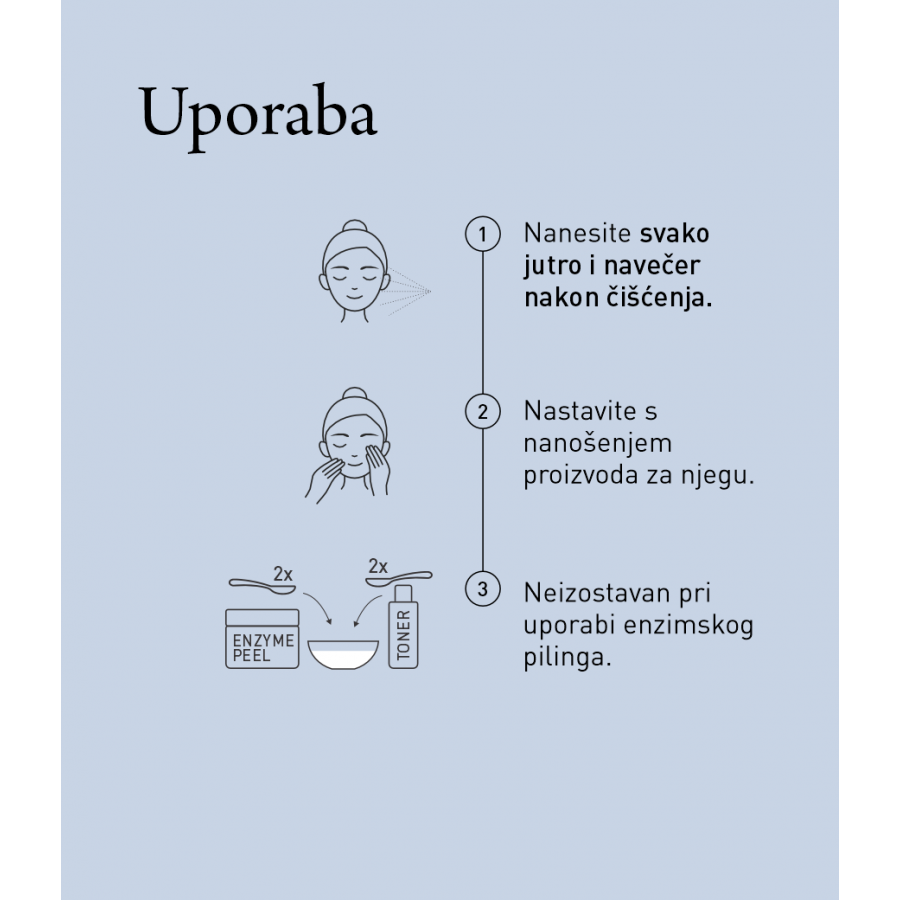 - Uspostavlja i čuva prirodnu pH ravnotežu kože nakon čišćenja te je priprema za optimalno prihvaćanje sastojaka iz daljnje njege.