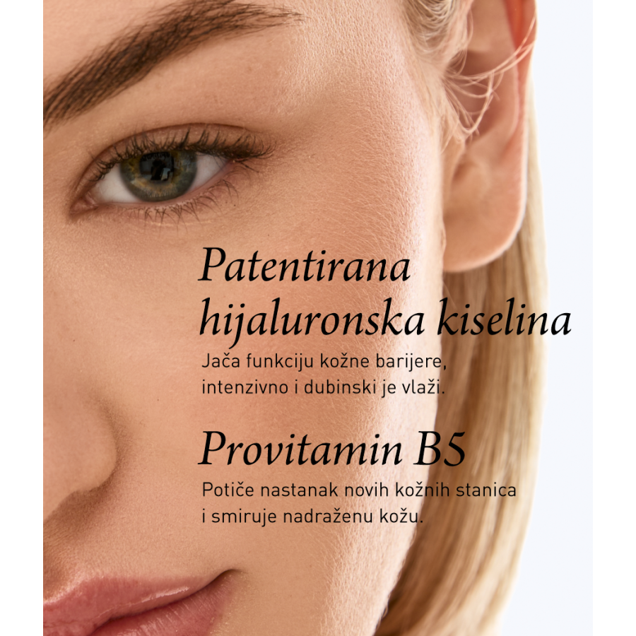 - Sadrži patentiranu hijaluronsku kiselinu male molekularne mase, koja osigurava intenzivno i dugotrajno vlaženje dubljih slojeva kože.