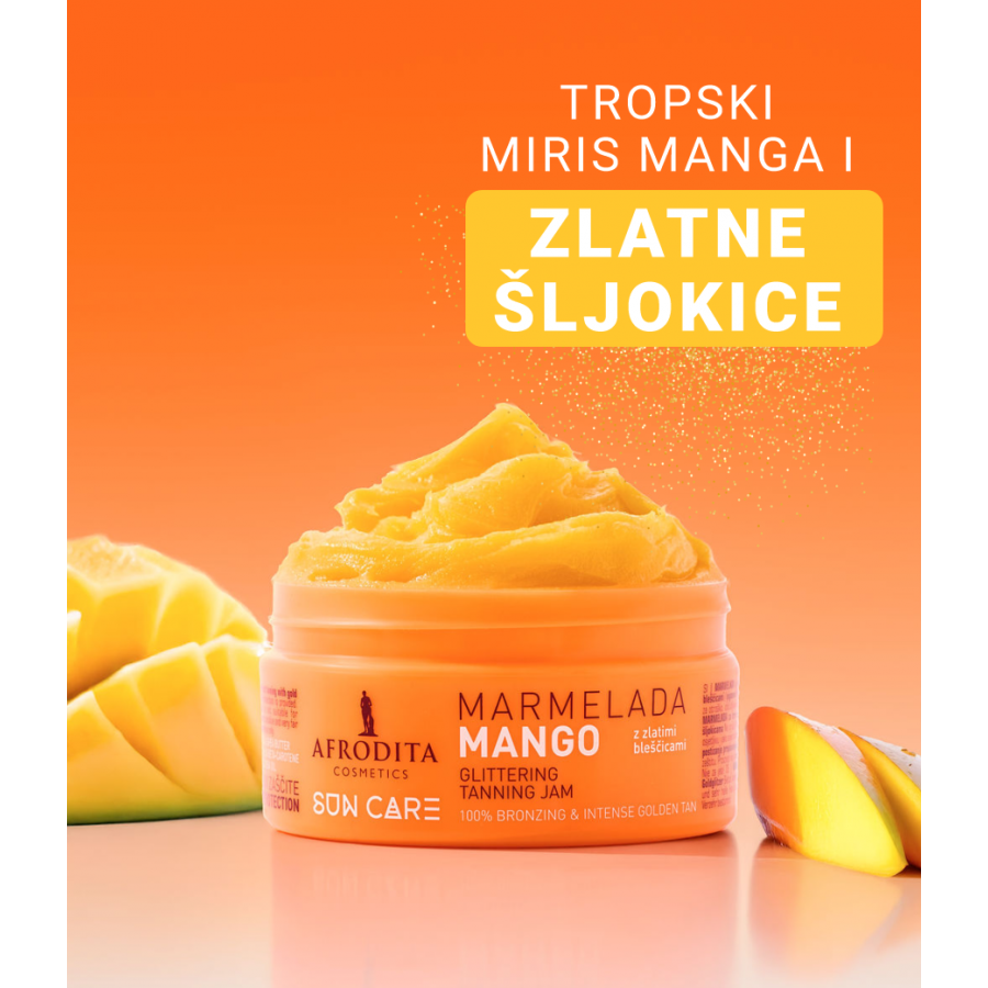 Marmelada Mango obavija tvoju kožu zamamnim egzotičnim mirisom manga i osigurava prekrasnu sjajnu preplanulost sa zlatnim šljokicama koje naglašavaju tvoj ten. Sa snagom 100 % prirodnih sastojaka – bogatog ulja manga, karite maslaca i ekstrakta mrkve – njeguje, omekšava i štiti kožu te joj daje privlačno zlatan sjaj. Idealna za one koji obožavaju egzotiku, profinjenost i prirodnu njegu.