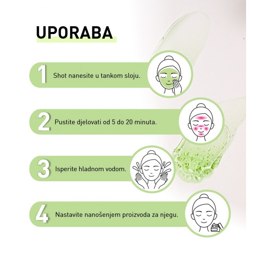 - Shot nanesite u tankom sloju na cijelo lice ili lokalno. Nemojte nanositi proizvod na područje oko očiju. Pazite da ne dođe u dodir s očima.