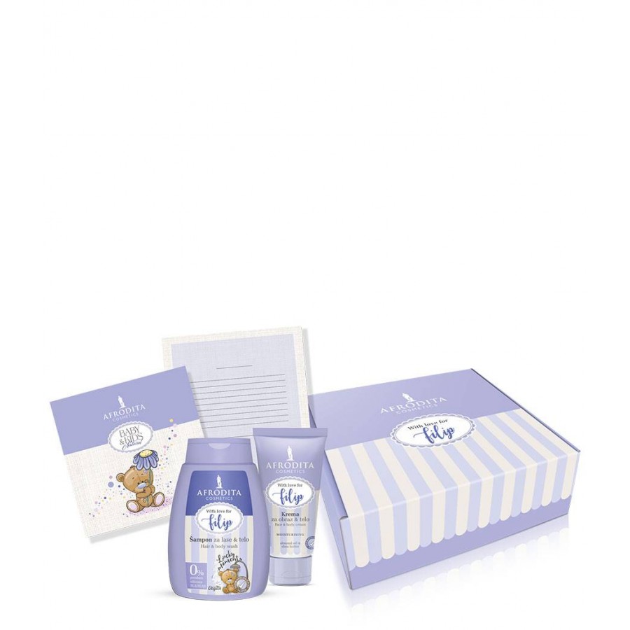 Paket proizvoda za njegu s ispisanim imenom mališana predstavlja divan poklon za rođendan, za Božić, za neku drugu prigodu ili samo tako – za veselo brčkanje i razigrane trenutke njege.