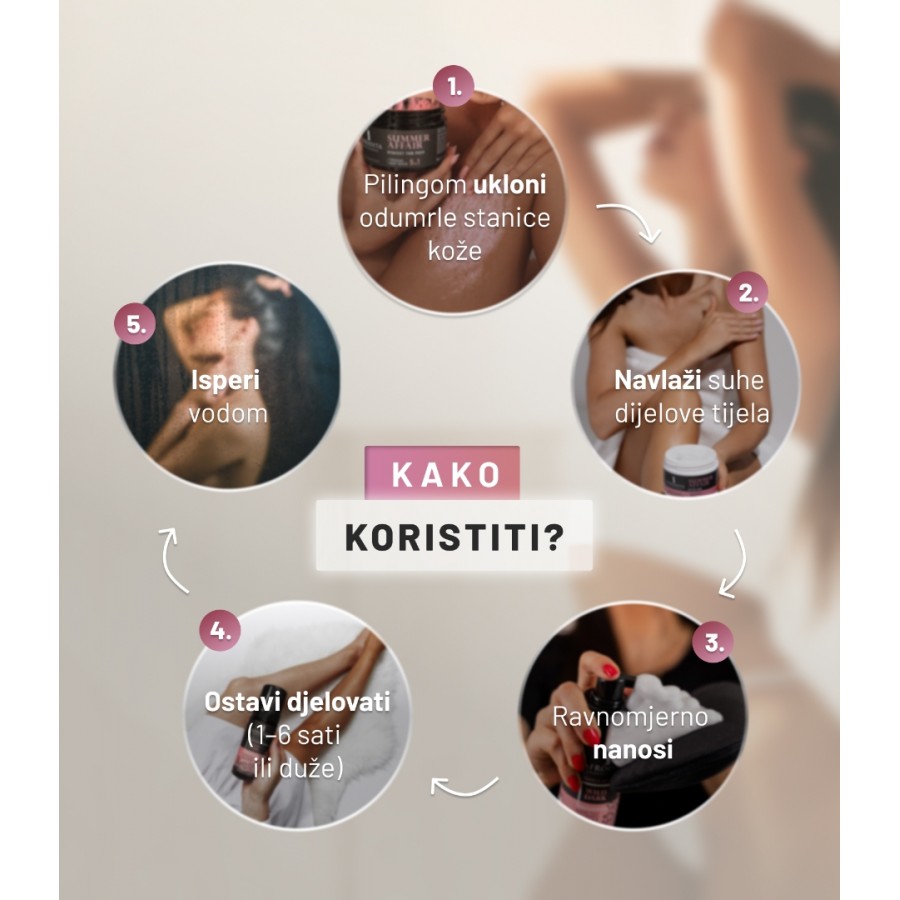 Dan ili dva prije nanošenja pjene za samotamnjenje provedi temeljit piling. Njime ćete s kože ukloniti odumrle stanice te omogućiti ujednačenije nanošenje pjene. Preporučujemo uporabu Premium pilinga 5-u-1 SUMMER AFFAIR, koji je stvoren posebno za pripremu kože na nanošenje proizvoda za samotamnjenje.