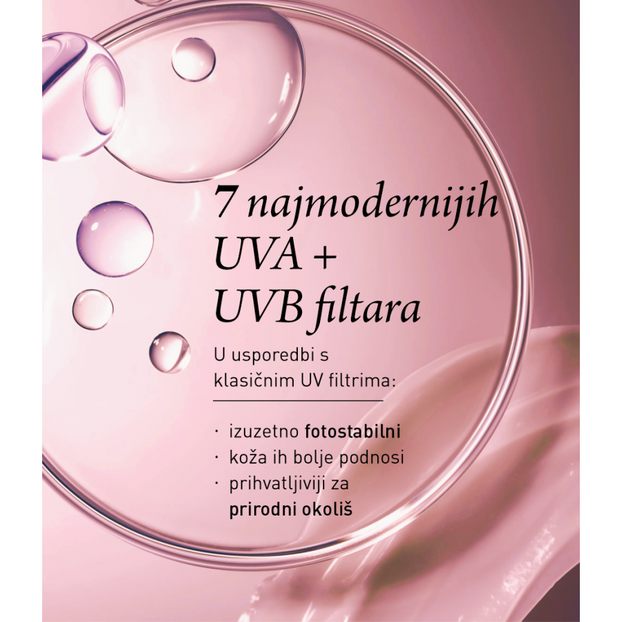 - Sadrži inovativnu kombinaciju sedam najmodernijih UV filtara. Odlikuju se izuzetnom fotostabilnošću koja pridonosi visokoj dermatološkoj toleranciji.