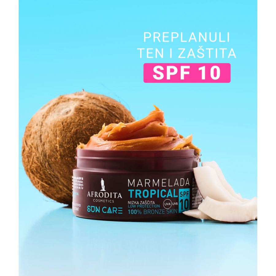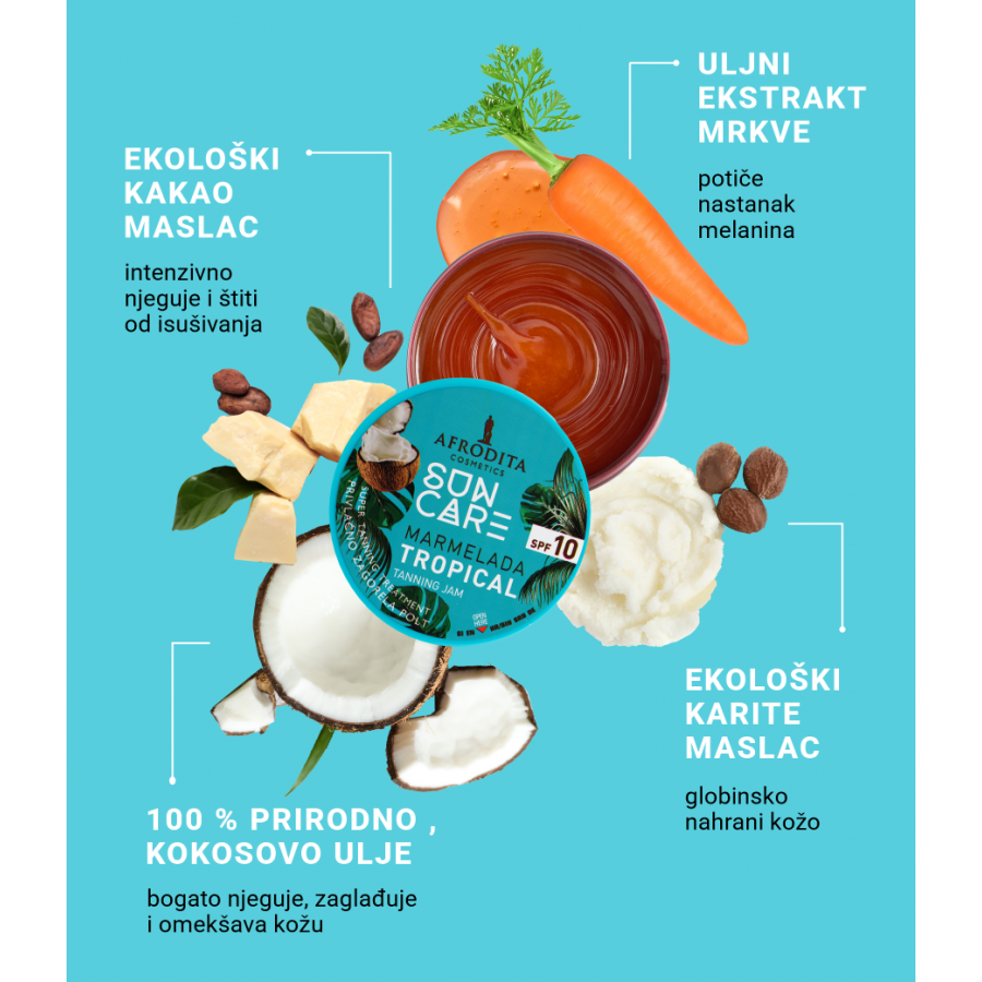 SUN CARE Marmelada Tropical SPF 10 za sunčanje obogaćena je kokosovim uljem, karite i kakao maslacem te beta-karotenom. Potiče prirodnu preplanulost, njeguje i omekšava kožu.