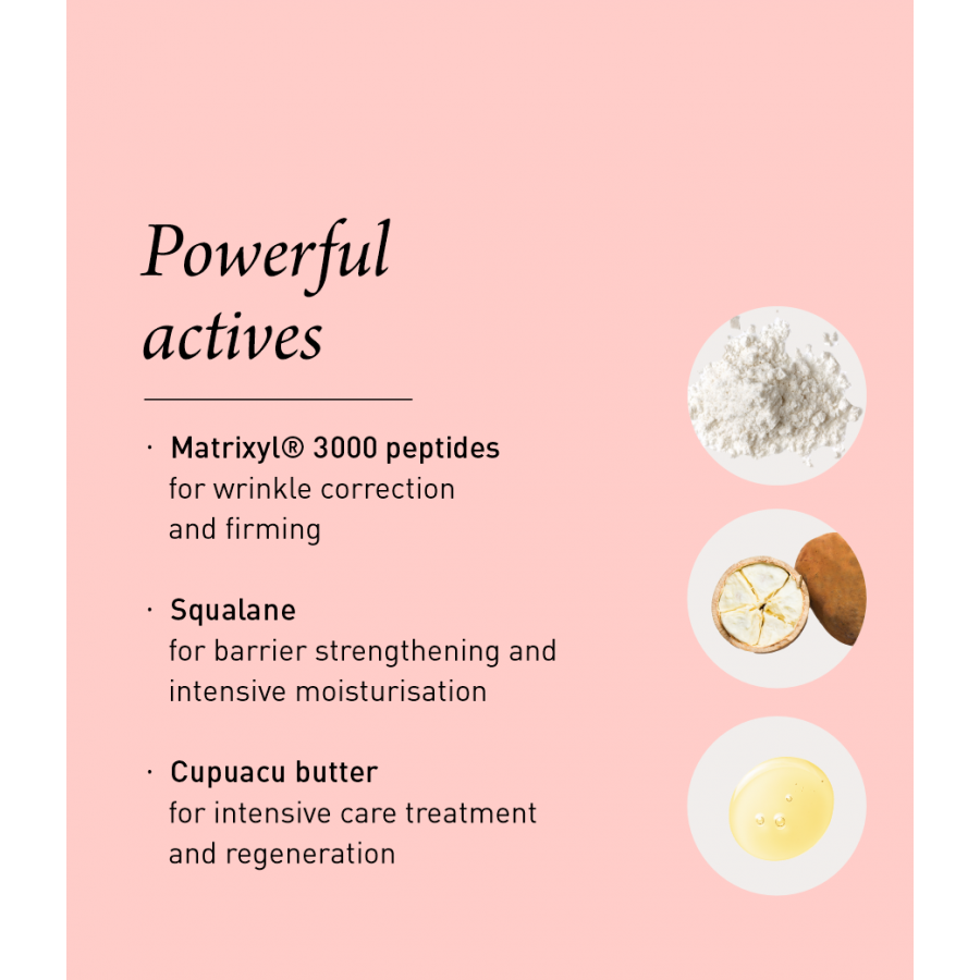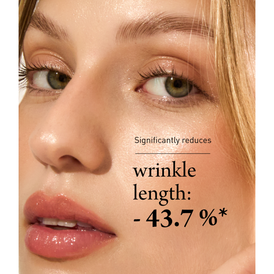 The peptides act directly on the skin cells, reviving their youthful potential! They stimulate the cells to divide faster and synthesise more collagen, elastin and hyaluronic acid. As a result, they slow down the chronological ageing and photo-ageing of the skin, rejuvenating it in every way: they visibly firm the skin, smooth its surface and produce an intensive wrinkle correction effect.