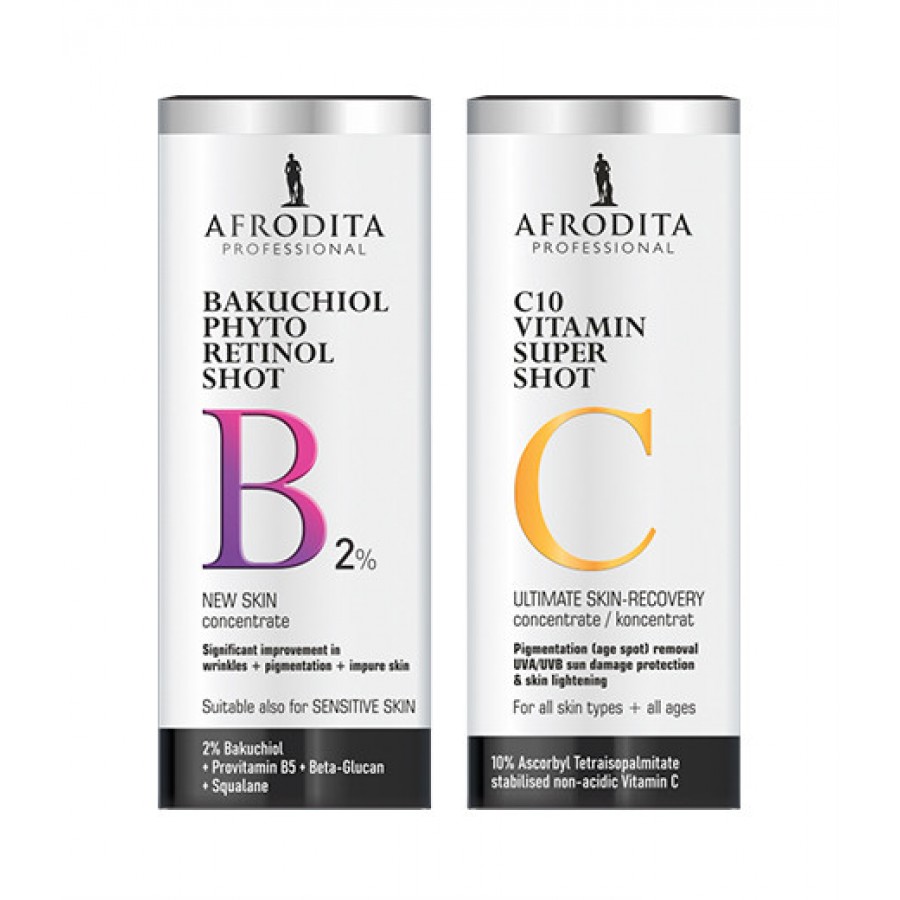 • C10 VITAMIN SUPER SHOT nanesite ujutru, a BAKUCHIOL PHYTO RETINOL SHOT uveče.