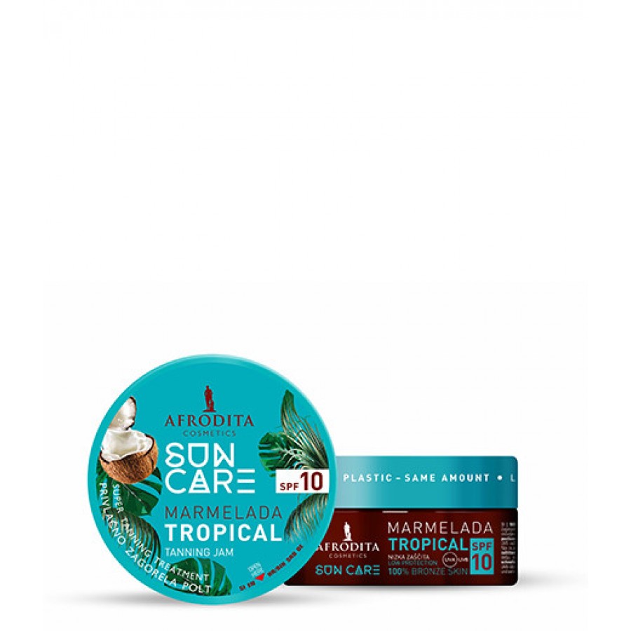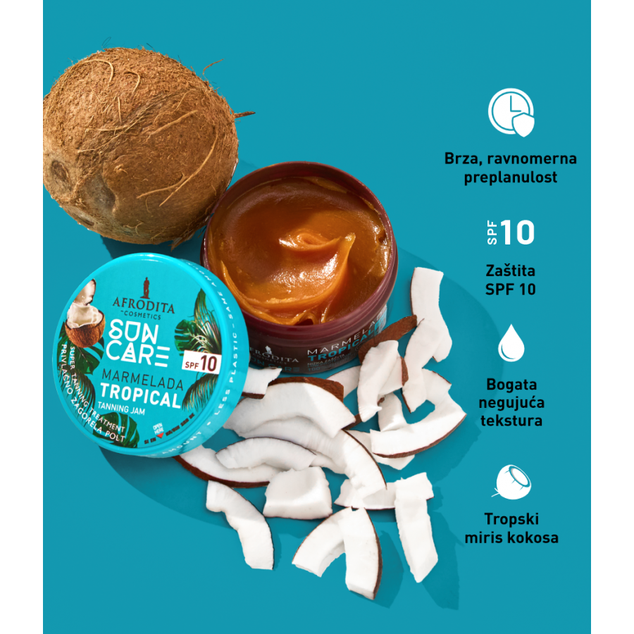 Ova marmelada sa zaštitnim faktorom SPF 10 omogućava sigurnije uživanje na suncu i istovremeno intenzivno postizanje privlačne preplanulog tena. Obogaćena 100 % organskim kokosovim uljem, kakao i karite maslacem hidrira, neguje i štiti kožu, a tropski miris vodi u svet egzotičnih doživljaja.