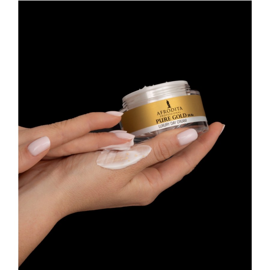 PURE GOLD 24 Ka Luksuzna dnevna krema sadrži luksuz čistog zlata koje u kombinaciji s izoflavonima značajno poboljšava strukturu kože i podržava njenu sposobnost regeneracije, što se ogleda u zaglađenim linijama i borama lica te vidljivo poboljšanom tonusu. Nakon dragocene 'zlatne' nege koža je podmlađena i zapanjujuće lepa.