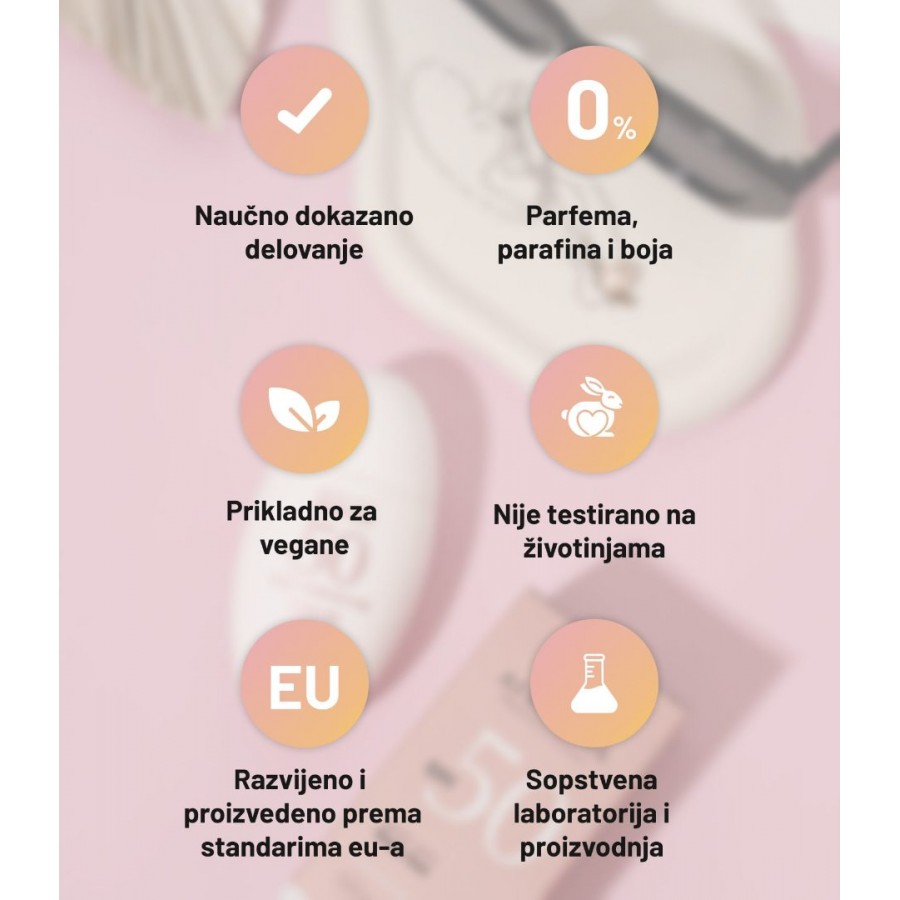 - VISOK NIVO UVA ZAŠTITE (22,2*) koja premašuje zakonom definisanu minimalnu vrednost (1/3 navedene SPF vrednosti)