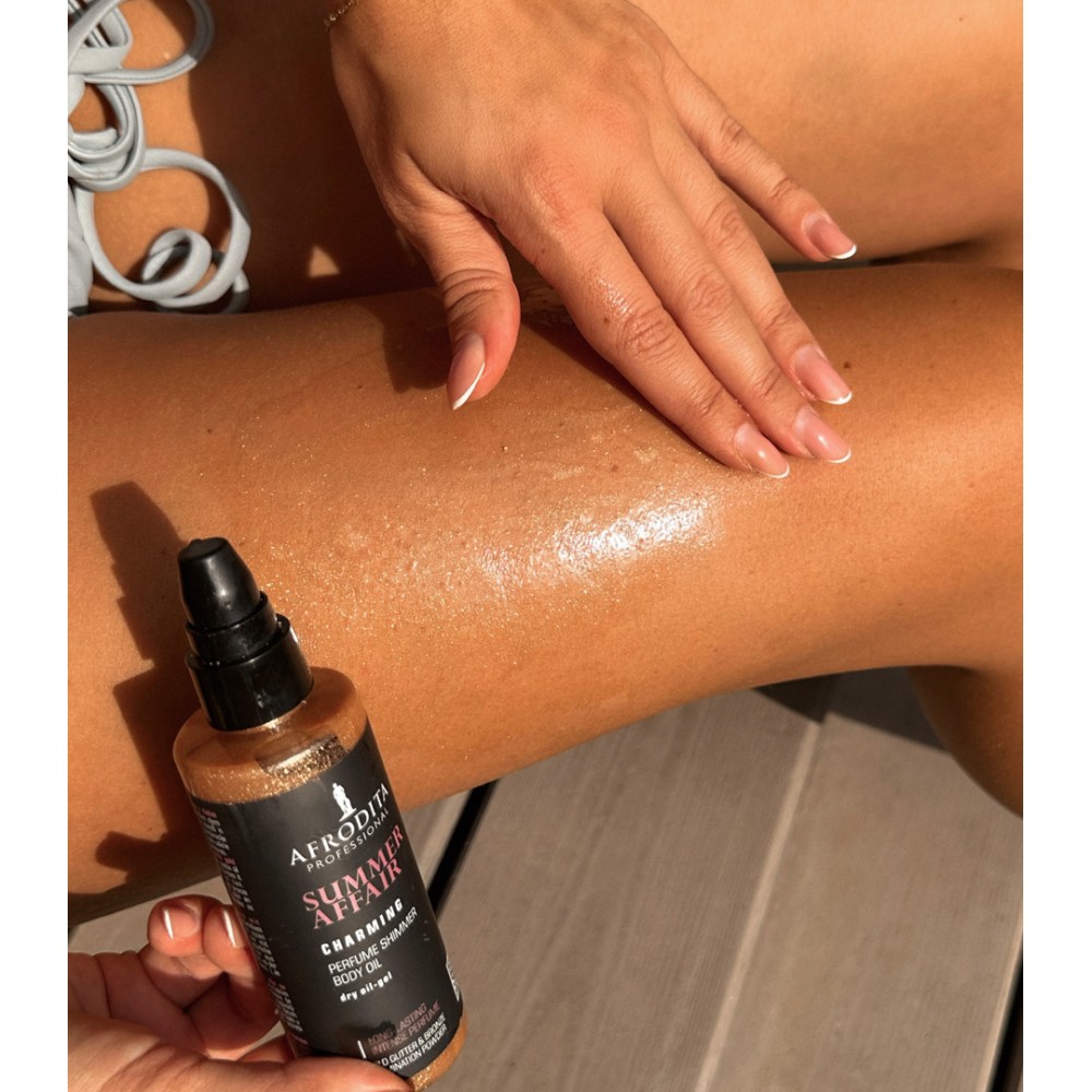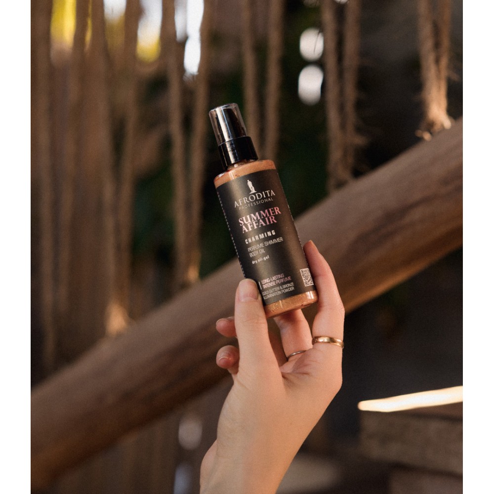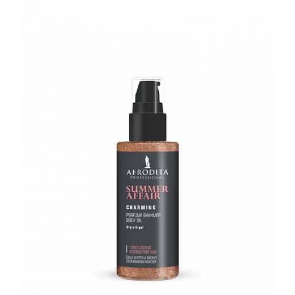 CHARMING SHIMMER BODY OIL - intenzivno parfumsko olje z bleščicami za telo, ki te bo odelo v privlačen zlat sijaj, tvoje telo pa bo objel božanski cvetlični vonj, ki traja in traja, vse do konca zabave. Nihče se ti ne bo mogel upreti. To očarljivo parfumsko olje prefinjenega cvetličnega vonja bo s svojim delovanjem tvoje poletne noči naredilo še bolj strastne: