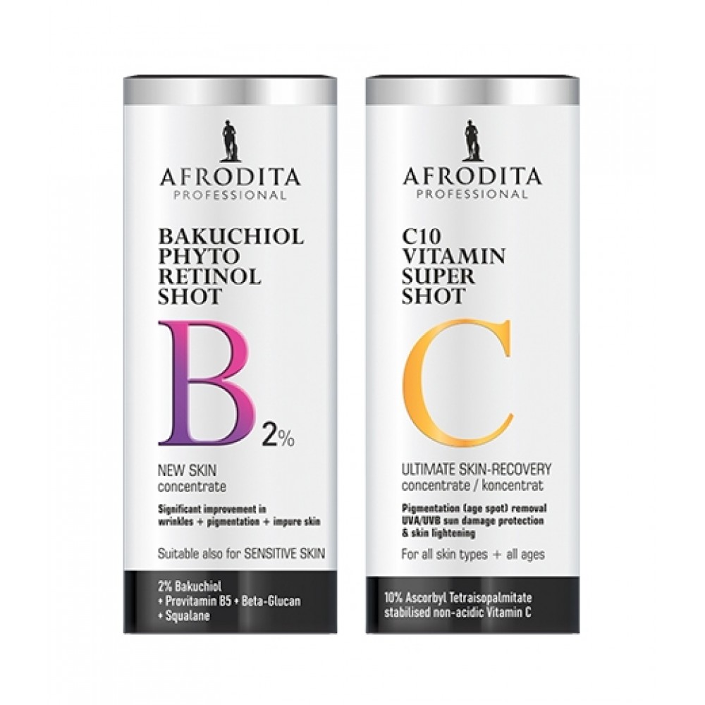 C VITAMIN SHOT deluje kot pigmentacijski korektor. Zmanjšuje pigmentne madeže ter z zaviranjem procesa melanogeneze hkrati preprečuje, da do pojavnosti le-teh sploh pride). BAKUCHIOL SHOT na drugi strani pa deluje kot močan antioksidant in spodbujevalec kolagena. Bistveno zmanjša izraženost gub ter kožo opazno učvrsti. Zmanjšuje tudi pigmentne nepravilnosti ter tako odlično podpira delovanje C shota.