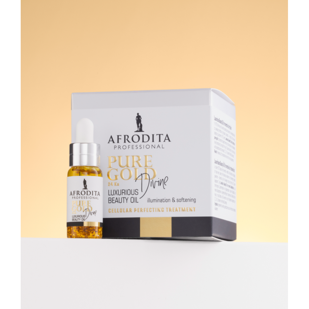 - Kraljevska kombinacija; v roki spojite PURE GOLD Divine Razkošni lifting serum in nekaj kapljic Pure Gold DIVINE 24 Ka Razkošnega lepotnega olja in nanesete na področje obraza, vratu in dekolteja.