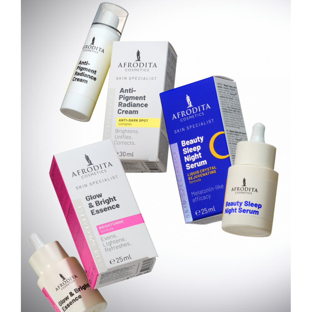 Inovativen biomimetični peptid, ki zavira sintezo melanina. Pomaga preprečevati nastanek temnih madežev, kožo posvetli ter razkrije bolj sijočo polt.