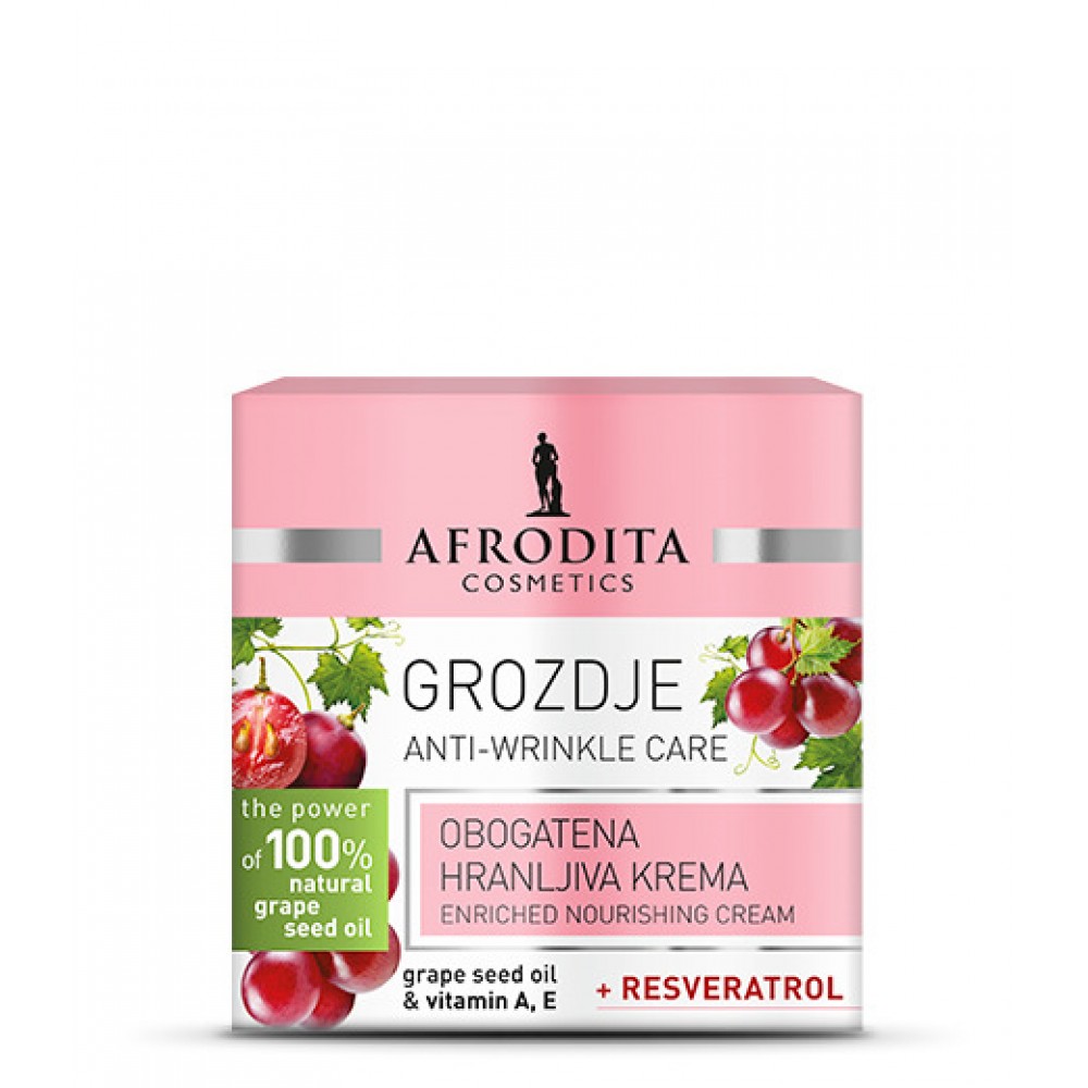 Bogata hranljiva krema s 100% naravnim oljem grozdnih pečk kožo intenzivno nahrani in pomaga v boju proti staranju. Navdušuje z dišečim vonjem in žametno teksturo, ki kožo ohranja negovano, brez neprijetnega občutka »zategovanja. Pripomore k povečani tvorbi kolagena, izboljša elastičnost kože, s čimer se opazno zmanjša videz gub.
